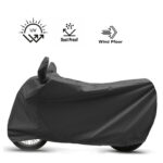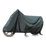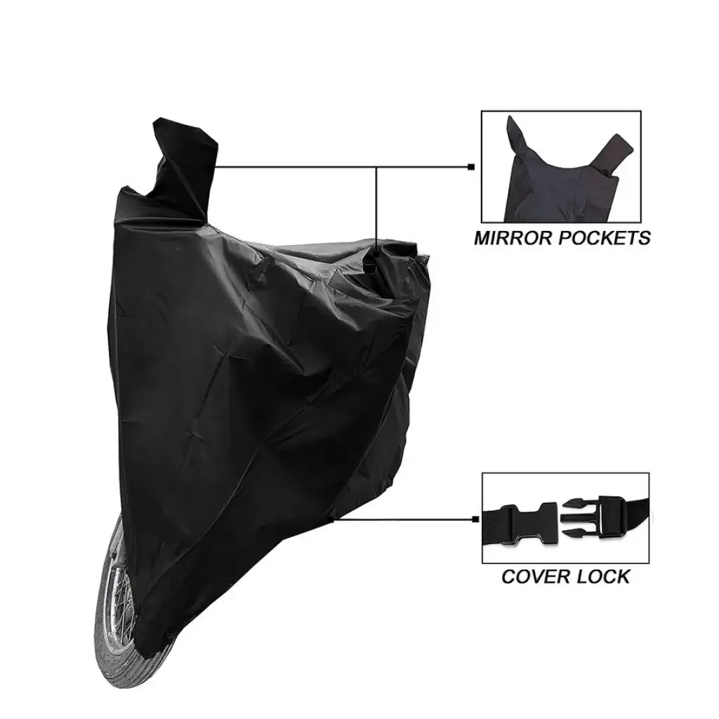 A durable, weather-resistant cover for all motorcycles and scooters. It protects against dust, sun, and rain with an elastic hem, buckle strap, and soft inner lining to prevent scratches.